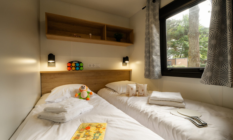 De ouderlijke suite heeft een bed van 160x200, omringd door comfort. De andere twee slaapkamers verwelkomen kinderen met bedden van 80x190, zorgvuldig opgemaakt bij aankomst.