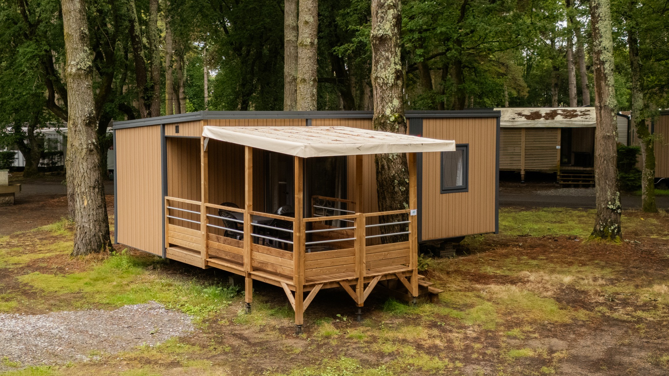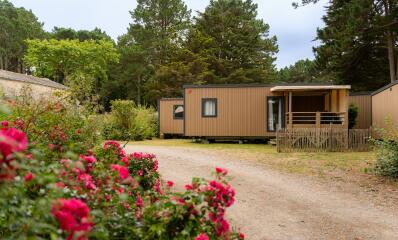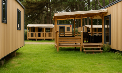 This mobile home rental, the 'Sorlock,' is ideal for a small family of 2 to 4 people! You will find the essential amenities for a pleasant stay at Le Petit Bois campsite in South Brittany. A well-equipped kitchen-dining area with dishes, refrigerator, freezer, microwave, and gas stove provides everything you need for simple cooking. Enjoy the integrated terrace with a covered wooden extension and its garden furniture or relax in front of the TV in the central living area. For a good night's sleep, our 'Sorlock' mobile home includes a bedroom with a double bed and a second bedroom with two single beds, each equipped with duvets, pillows, and heating. Experience all the sanitary comfort with a bathroom and separate toilet directly in the mobile home. Take advantage of pitches ranging from 80m² to 100m².