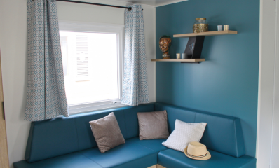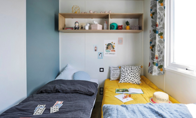 For a good night's sleep, our mobile home cottage Le Belle-Ile has 2 parents' bedrooms, one with a queen size bed (160x200) and the other with a double bed (140), and two bedrooms with 2 single beds, each equipped with duvets and pillows and heating.
