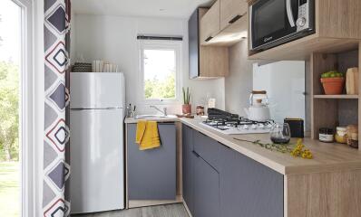 La cuisine est équipée et aménagée avec vaisselle, lave-vaisselle, frigo avec congélateur, micro-onde et plaque de cuisson gaz, l'indispensable pour cuisiner pendant votre séjour vacances.