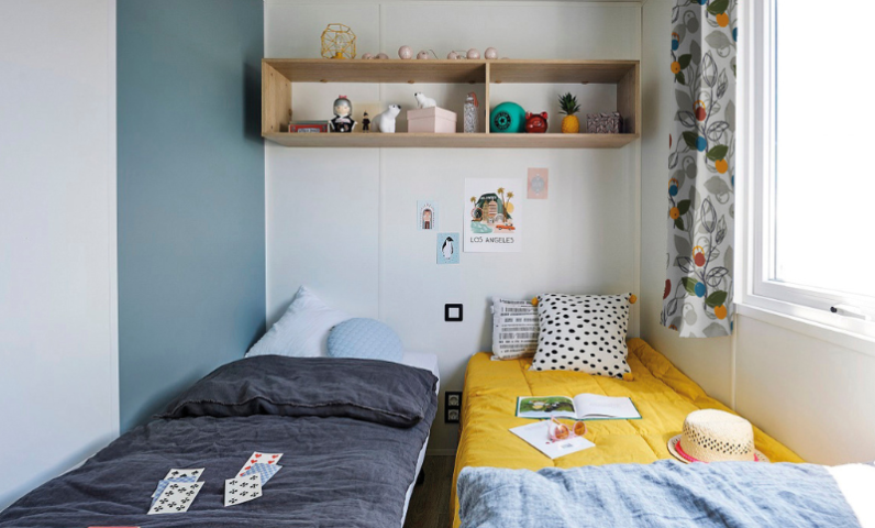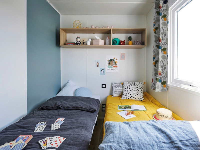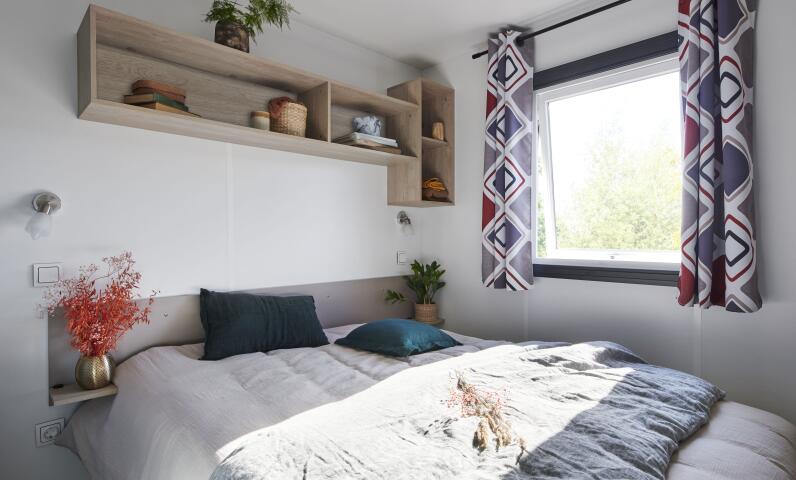 Pour passer de bonnes nuits, notre mobil home prestige Dumet comprend 2 chambres parents dont 1 avec un lit Queen size en 160x200 et le 2eme lit en 140 pour 2 pers et 2 chambres avec 2 lits de 1 pers chacune équipée avec couettes et oreillers et chauffage.