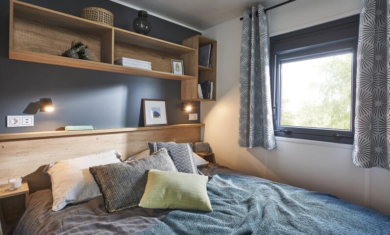 Voor een rustige nachtrust beschikt de stacaravan Luxe Merquel over een slaapkamer met een ruim bed van 160x200, compleet met dekbed en kussens, en een verwarmingssysteem voor je comfort.