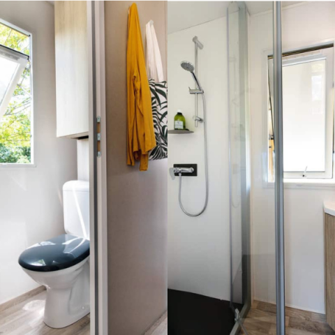 De badkamer en het toilet zijn direct in de stacaravan geïntegreerd.